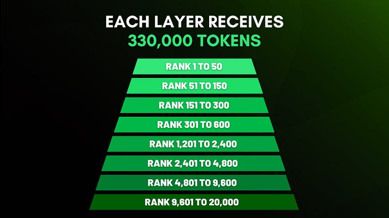총 9개의 단계가 설계되어 있습니다. 각 층은 에어드롭 양의 11.11%인 330,000토큰을 분배받게 됩니다. 높은 층일 수록 적은 수의 인원들이 해당되니 받을 수 있는 물량이 더 많아지겠죠? 그리고 일단 참여만 해도 에어드랍을 받을 수 있다는 것이니 무조건 참여하시길 추처드립니다.