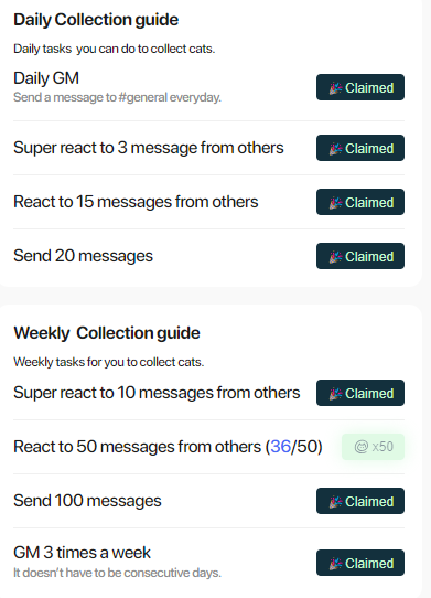 - 주간미션: 스시 10개 받기 // 릴엑션 50개 받기 // 메시지 100개 보내기 // gm 3번하기