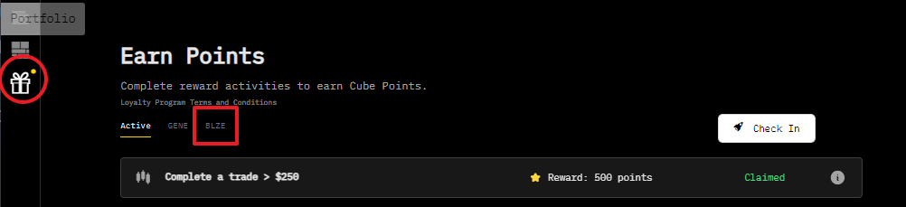 - reward(선물상자 아이콘) 클릭 - 매일 체크인 하며 포인트 획득 - Blze 클릭
