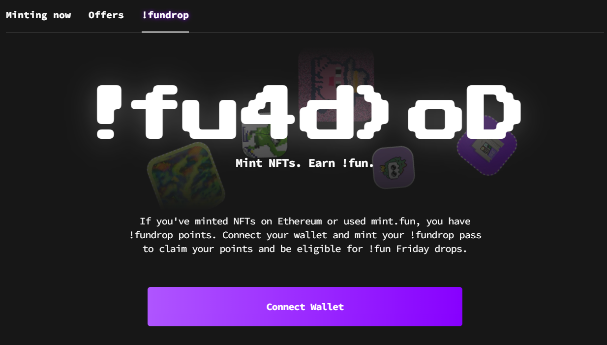 Mint NFTs. Earn !fun. Mint your !fundrop pass to claim your points and start climbing the leaderboard