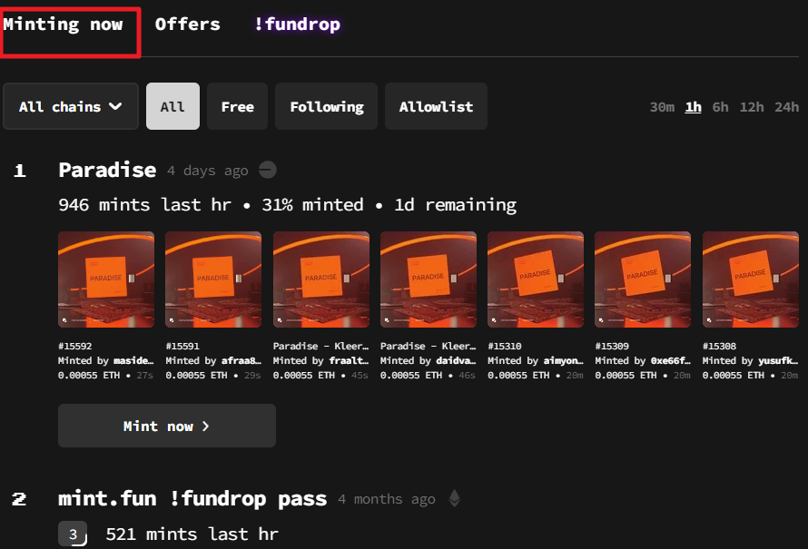 라. 네번째는 하루에 한번씩 민팅하는 미션입니다. 상단의 메뉴에서 Minting now를 클릭하여 들어가면 민팅 가능한 NFT들이 나옵니다. 그중에서 무료 민팅들이 있으니 소량의 가스비만 지출하면서 민팅하시기 바랍니다. 이때, base 나 zora 메인넷의 NFT를 민팅하시면 둘의 에어드랍을 위한 트잭도 함께 남겨줄 수 있겠죠?