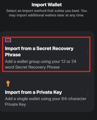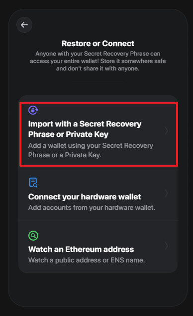 아래 사이트에 접속하셔서 휴대폰 또는 자신에게 맞는 브라우저를 선택하여 지갑을 설치합니다. 이제 기존의 메타마스크를 레인보우로 가져옵니다. 아래와 같이 순서대로 진행해서 메타마스크의 비밀 문구를 입력하여 연동시켜 줍니다.