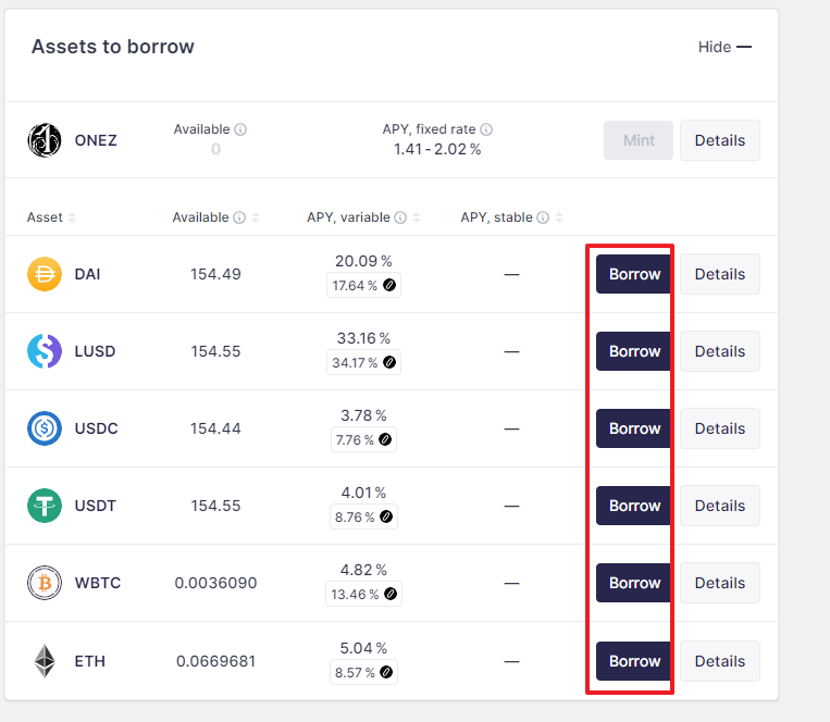 - Dashboard 클릭 - Borrows 메뉴에서 자신이 유동성 제공한 자산의 Borrow 클릭! - 유동성 제공한 만큼의 약 40% 대출