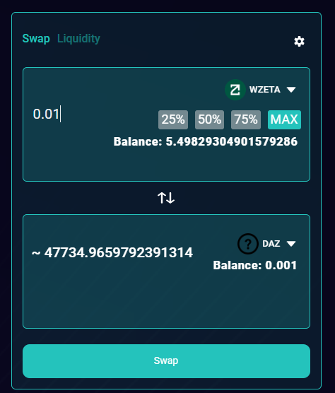스왑 화면에서 아래 '?'를 클릭하여 DAZ의 스마트 컨트랙을 넣어주시면 아래에 토큰이 나옵니다. 토큰을 클릭하여 스왑을 진행하시면 됩니다.