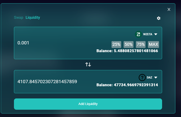 스왑완료 후 'Liquidity' 클릭하여 유동성 제공 화면으로 이동 -> 'Add Liquidity'클릭 -> 제타-DAZ 토큰 선택(이때에도 물음표 클릭하여 스마트 컨트랙 입력하여 DAZ토큰을 불러와야함) -> 수량 입력 -> 컨펌.