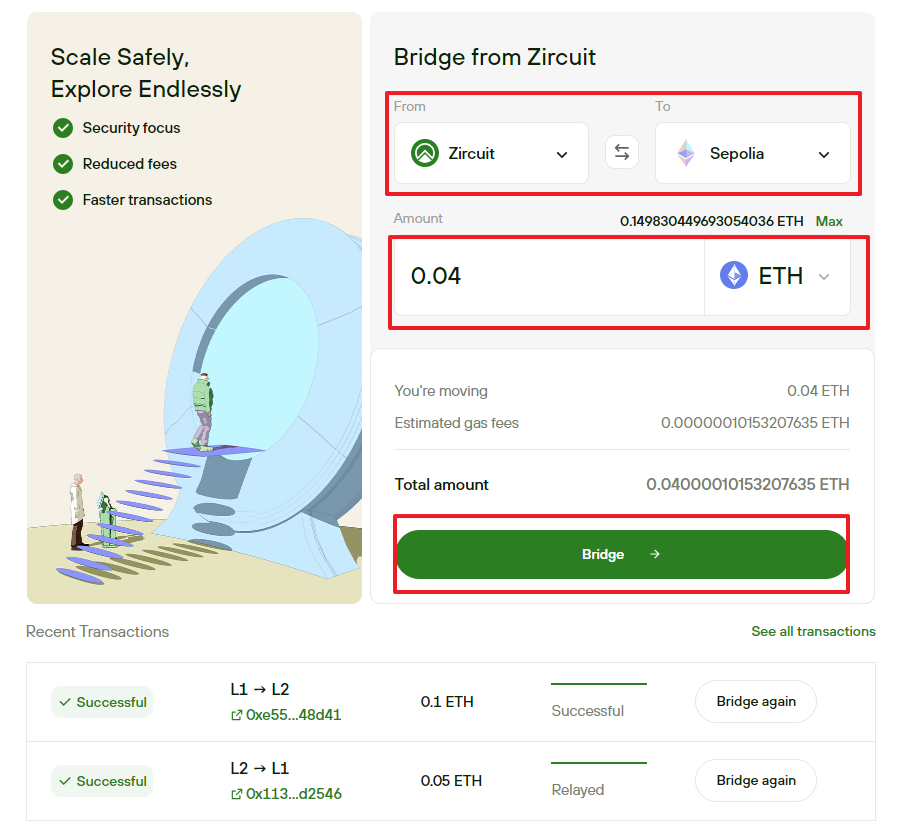 - sepolia - zircuit 브릿지 후 zircuit-sepolia 다시 브릿지(6시간 정도 소요)